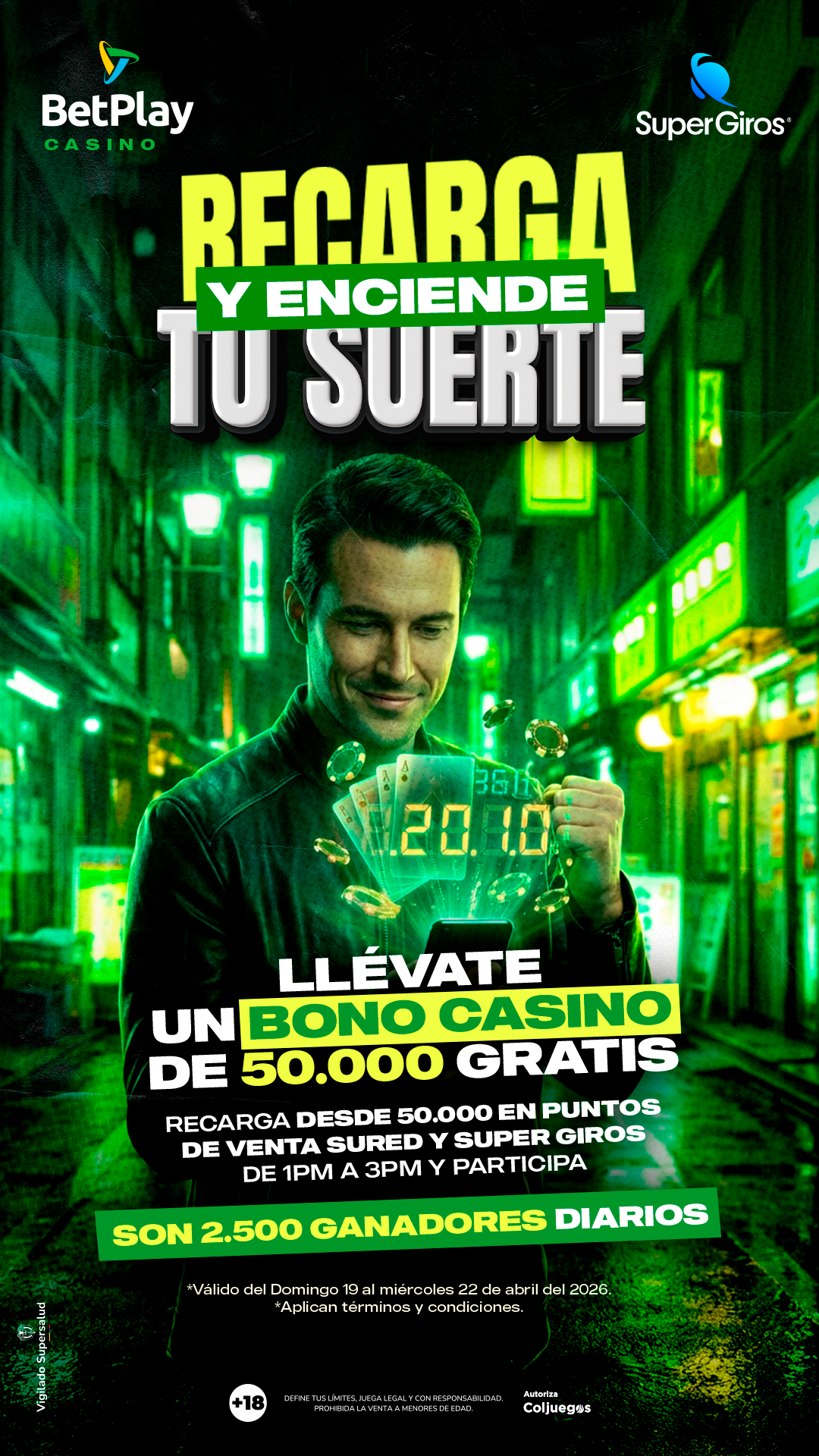 Participa en la actividad “R1135 Recarga y Enciende tu Suerte”, desde el Domingo 19 de abril de 2026 hasta el miércoles 22 de abril de 2026, las primeras 2.500 personas de cada día que realicen depósitos en PDV por valor igual o superior a $50.000, entre la 1:00 p.m. y las 3:00 p.m., ganaran un Bono gratuito de Casino por un monto equivalente a 50.000 créditos para la participación. Cada participante podrá ganar únicamente una vez por la vigencia del promocional. Aplica para depósitos a cuentas BetPlay realizados en puntos de venta físicos Su Red y/o Super Giros en el país, de acuerdo con el rango y condiciones descritos en el presente documento.